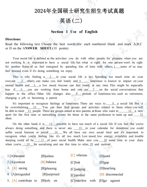 2024硕士研究生考试初试时间为12月23日-24日,在2024考研初试英语考试结束后,知道大家都在关注2024年考研真题及解析,海天考研网为各位考生带来2024考研英语真题及解析汇总,包括考研英语二的完型填空、阅读理解、新题型、英译汉和写作5大部分,助力各位考生备考。